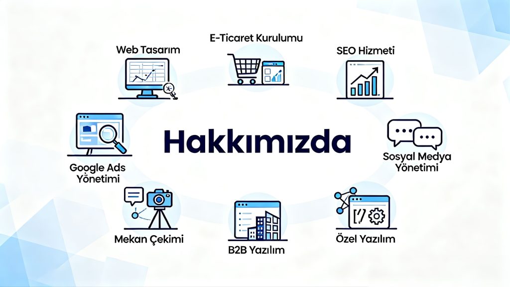 Web tasarım, e-ticaret kurulumu, SEO, Google Ads, sosyal medya yönetimi, mekan çekimi, B2B yazılım ve özel yazılım hizmetleri sunuyoruz.